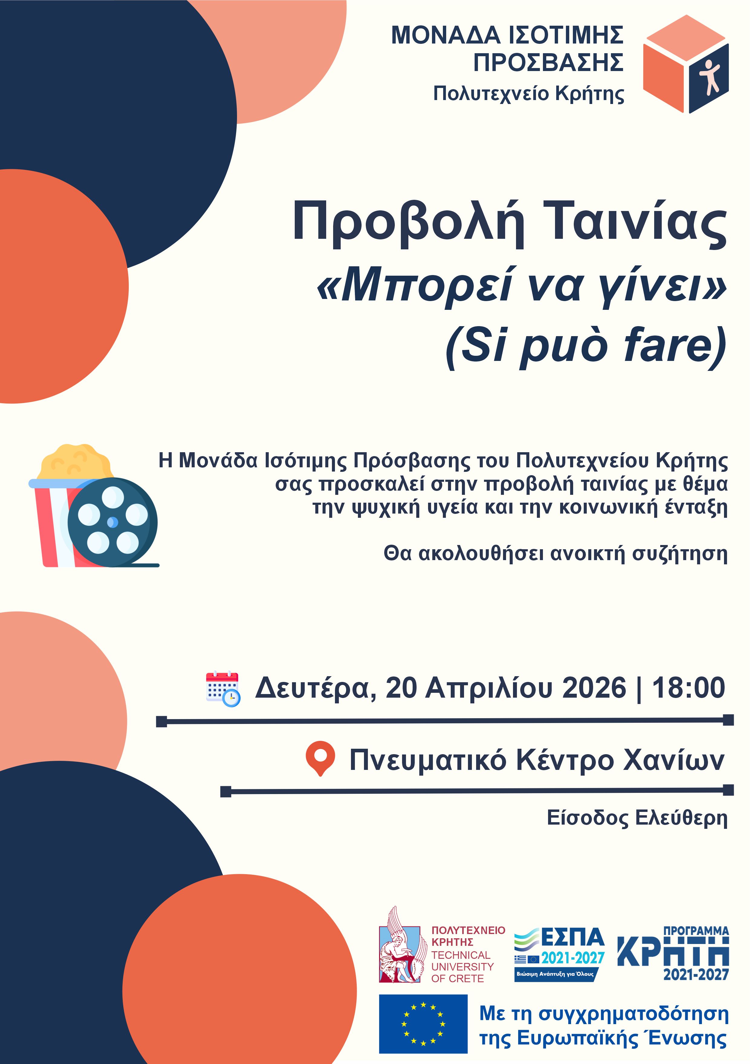 The Equal Accessibility Unit of the Technical University of Crete is organizing a screening of the film “Si può fare” (“It Can Be Done”), focusing on mental health, rehabilitation, and social inclusion.